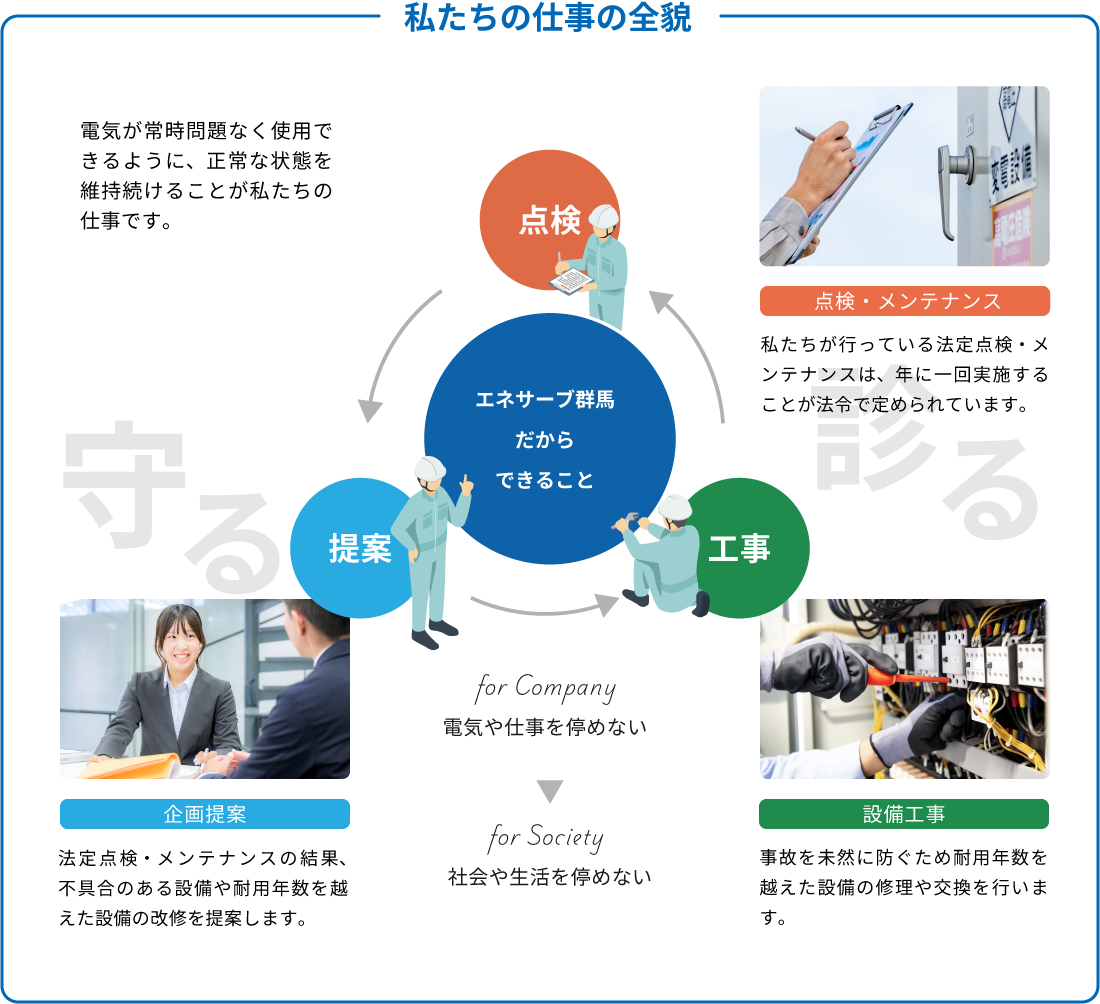 私たちが強みとするこの電気設備業界では、実は「法定点検・メンテナンス(設備点検事業)」と「電気設備の新設・改修(電気工事業)」を両立できる会社は決して多くありません。通常、企業は点検で設備更新が必要になると、別の工事会社に工事を依頼することになりますが、私たちはワンストップで対応することができ、これがお客さまに評価いただいている大きな強みとなり、一度お取引をさせていただいたお客さまと非常に長い年月、お客さまにとって必要不可欠な「電気インフラの守り手」として関係を深めていくことになります。