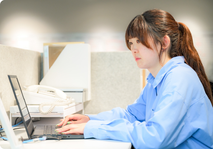 事務職である私の主な仕事は、データ入力、請求書作成、電話応対、来客対応などです。特にメインとなるデータ入力は、当社が手がけた設備点検の報告書(基本的に手書き)をエクセルによってデータ化していくものです。大手の工場ともなると300ページに及ぶこともあり、正確さとスピードの両立が求められます。こうした大きな仕事をやり終えたときは、高校時代と比べてタイピング力が大幅に向上したことを実感。お客様に提出する報告書なので、校正で間違いをつぶしていくことも必須です。この業務を社員として携わるのは私が初めてだったため、当初は業務手順をマニュアル化しながら作業を進めました。